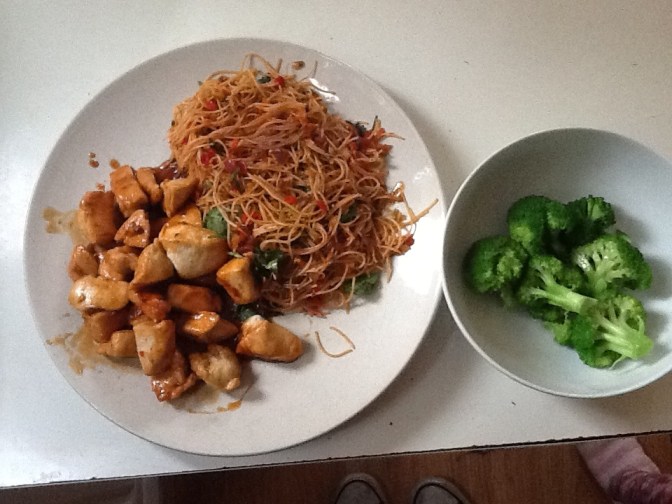 7.30: dinner – 350g chicken stir fried in soy sauce and honey; rice noodles with finely chopped red pepper, red onion, coriander stalks (dressing: 1 tbsp sesame oil, 1 tbsp soy sauce, 1tsp fish sauce, juice of one lime). Broccoli.