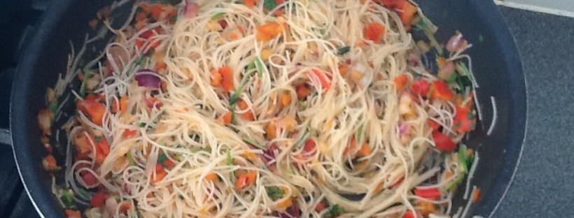 Ingredients: ready to use rice noodles, 1 red pepper, 1/2 red onion, chilli flakes, handful coriander, 2 tablespoons soy sauce, 1 lime, 1 teaspoon fish sauce, 1 teaspoon sesame oil.